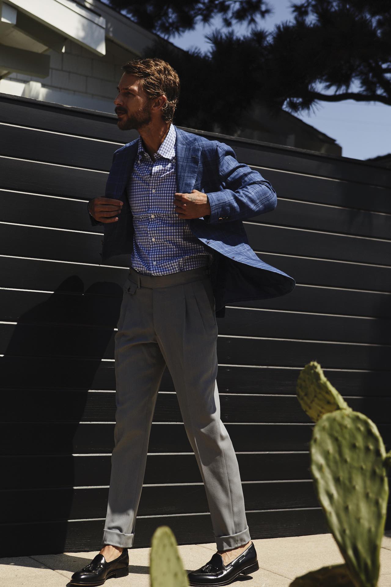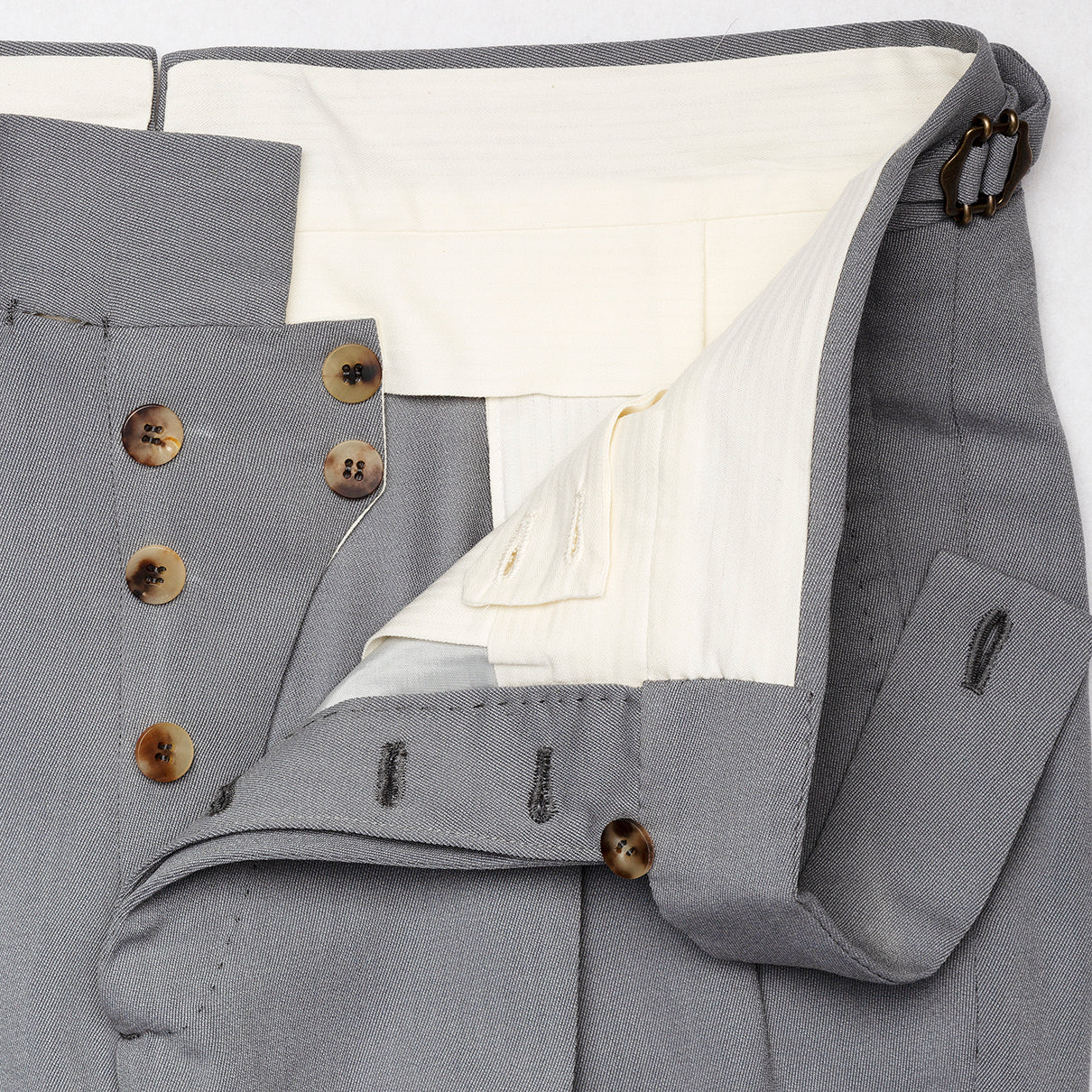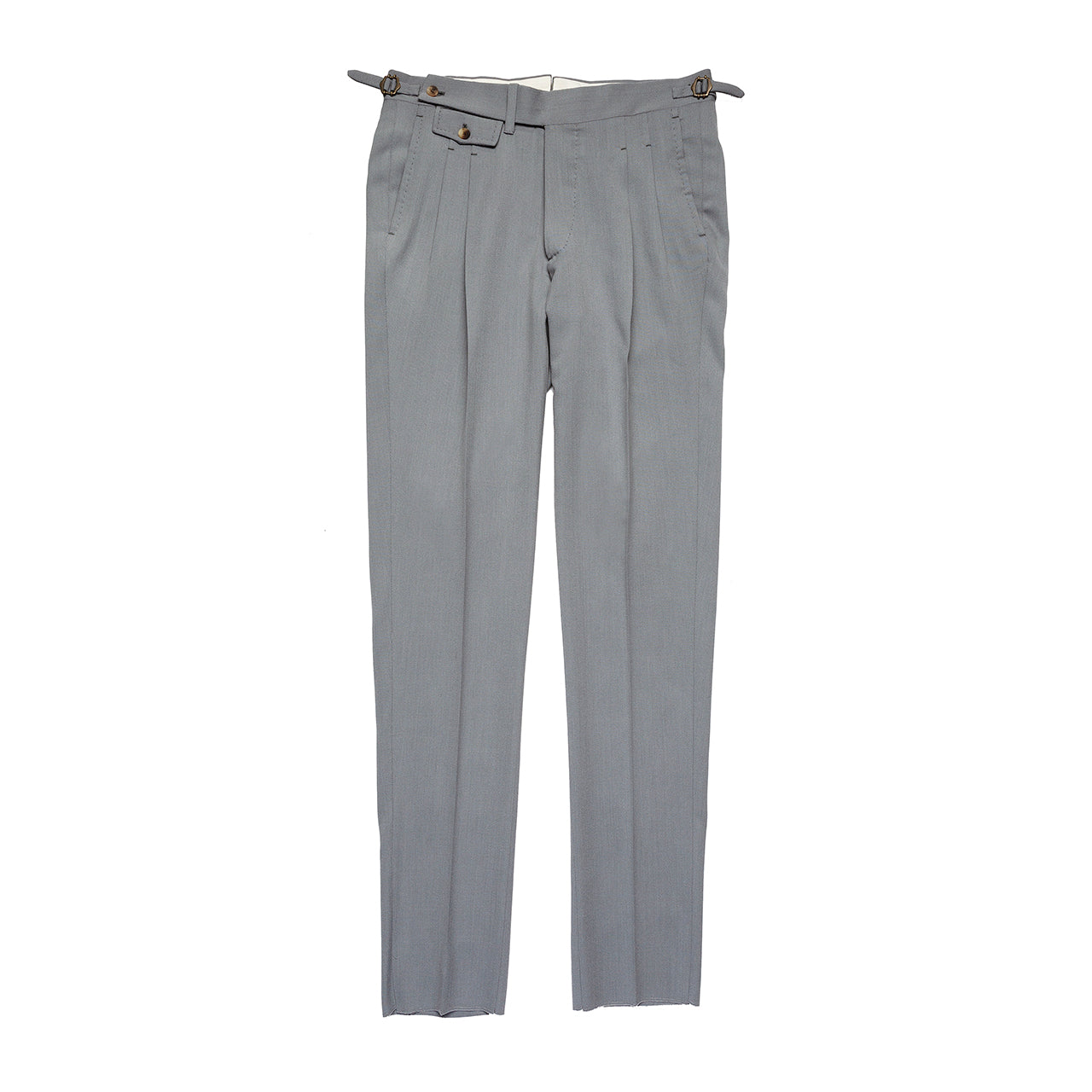 Understated and elegant, and underpinned by traditional Italian craftsmanship, our light grey trouser is a sartorial summer staple. Cut from a blend of virgin wool and cotton – woven by our compatriots at Loro Piana – they are robust and refined. A double pleated front affords comfort in the height of summer, whilst an extended waist tab, side adjusters and button coin pocket allude to the artisanal tenets of Orazio Luciano’s classical Neapolitan tailoring.