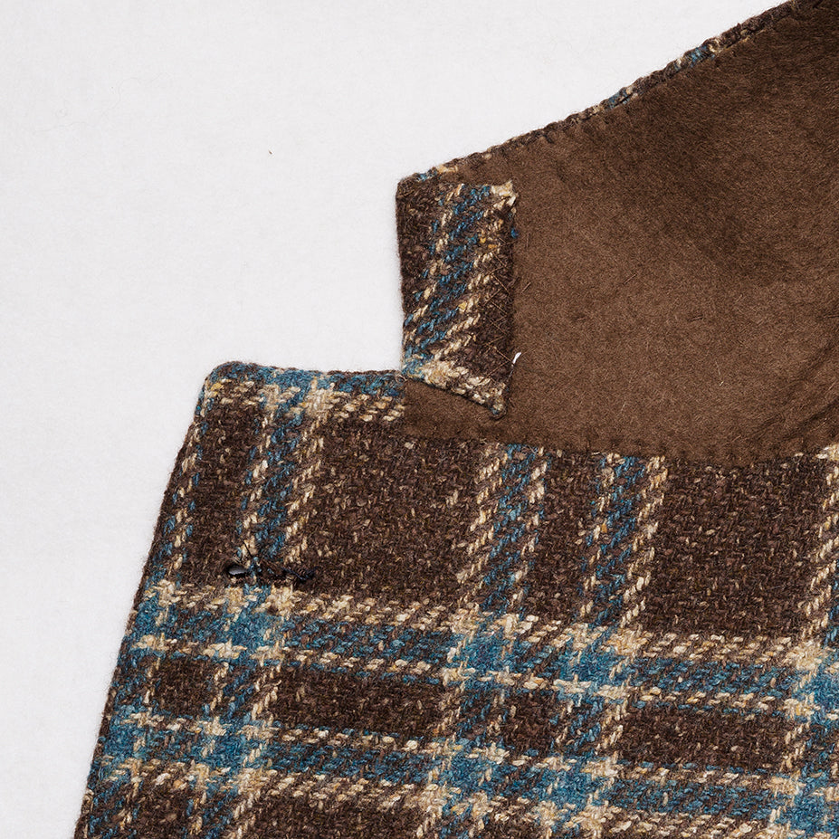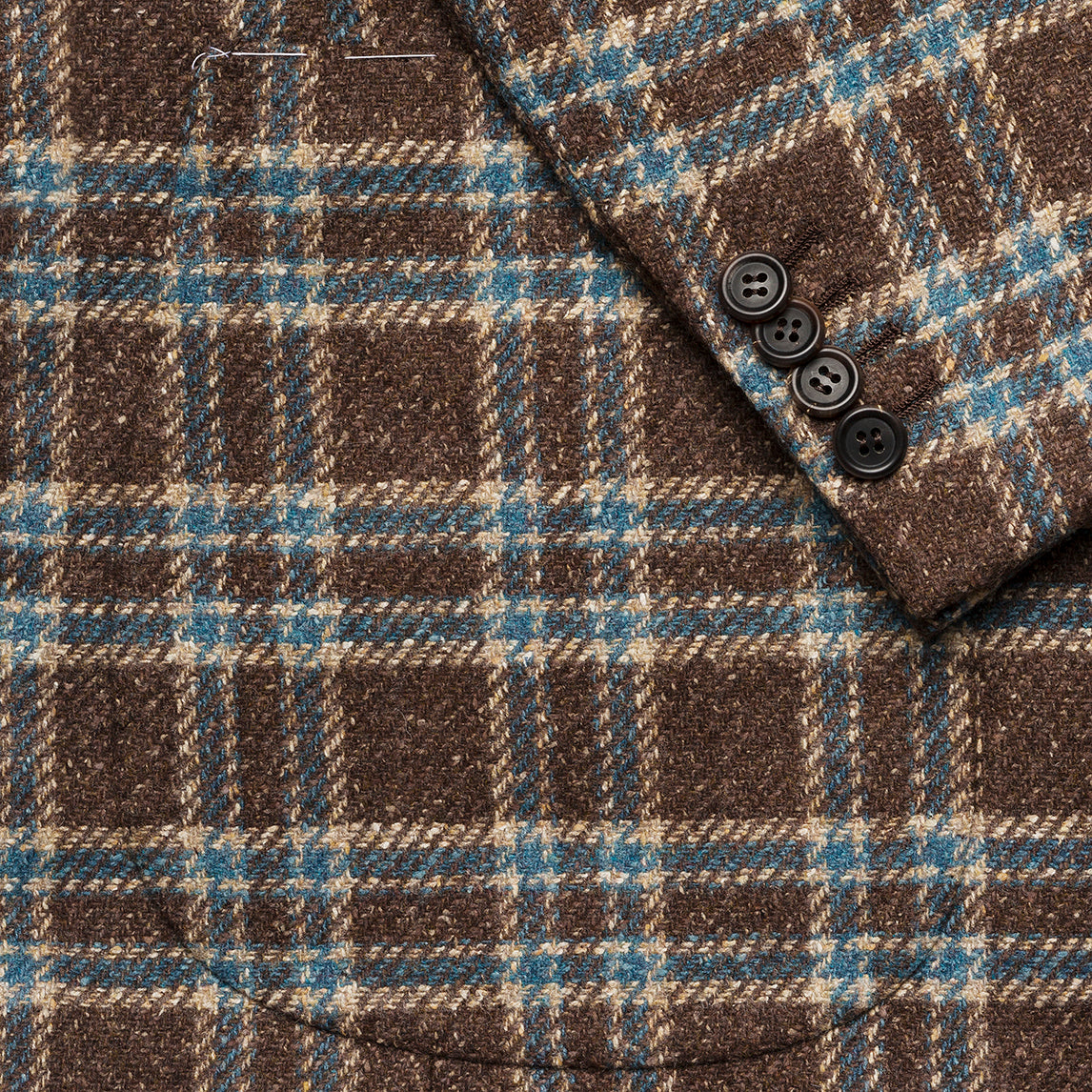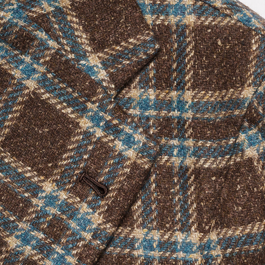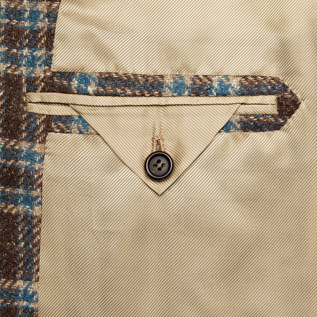 Cut from a blend of wool and silk from Solbiati, this jacket is defined by its textural nuances and bold blue and cream check. Made by artisans in Italy under the watchful eye of Orazio Luciano himself, it bears the hallmarks of Neapolitan handcraft - evinced in the subtle shirring of the spalla camicia shoulder, the gentle curve of the barchetta chest pocket and the functional buttonholes. Styled with a single breasted three roll two button front and patch pockets, it is a sophisticated and sportive winter jacket - perfect for wear with our light beige trousers.