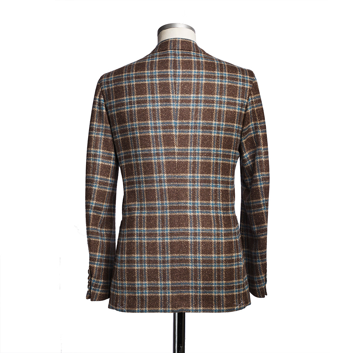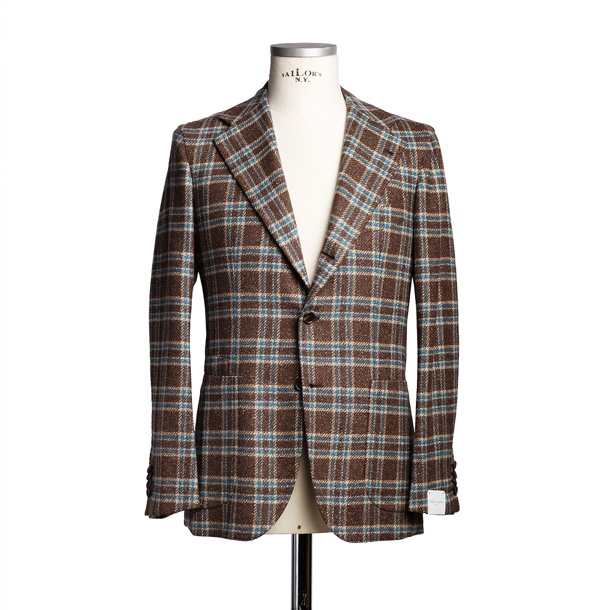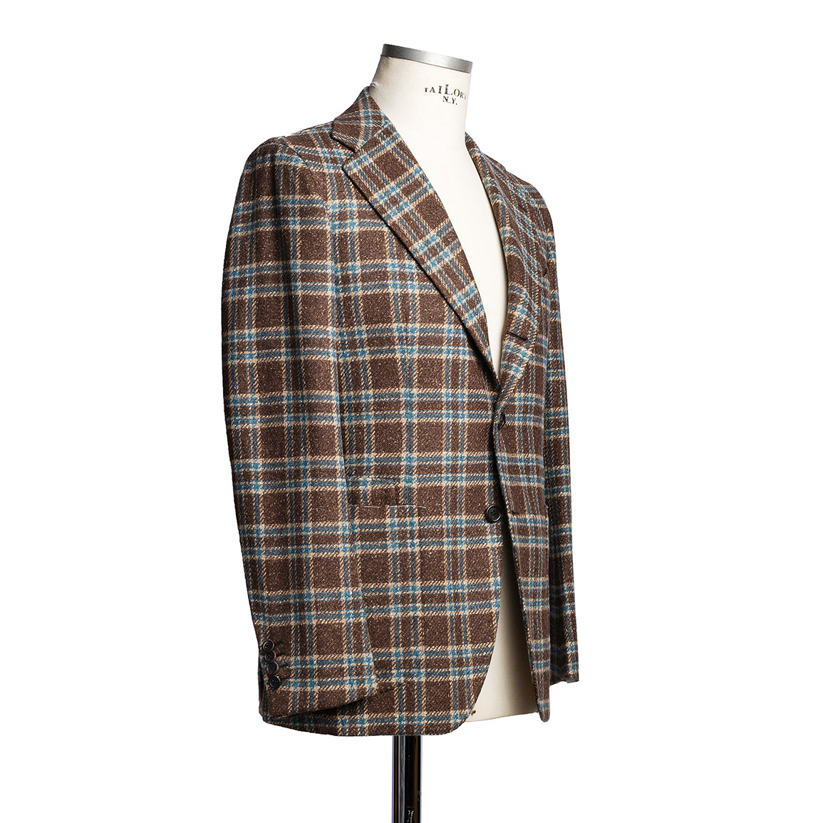 Cut from a blend of wool and silk from Solbiati, this jacket is defined by its textural nuances and bold blue and cream check. Made by artisans in Italy under the watchful eye of Orazio Luciano himself, it bears the hallmarks of Neapolitan handcraft - evinced in the subtle shirring of the spalla camicia shoulder, the gentle curve of the barchetta chest pocket and the functional buttonholes. Styled with a single breasted three roll two button front and patch pockets, it is a sophisticated and sportive winter jacket - perfect for wear with our light beige trousers.