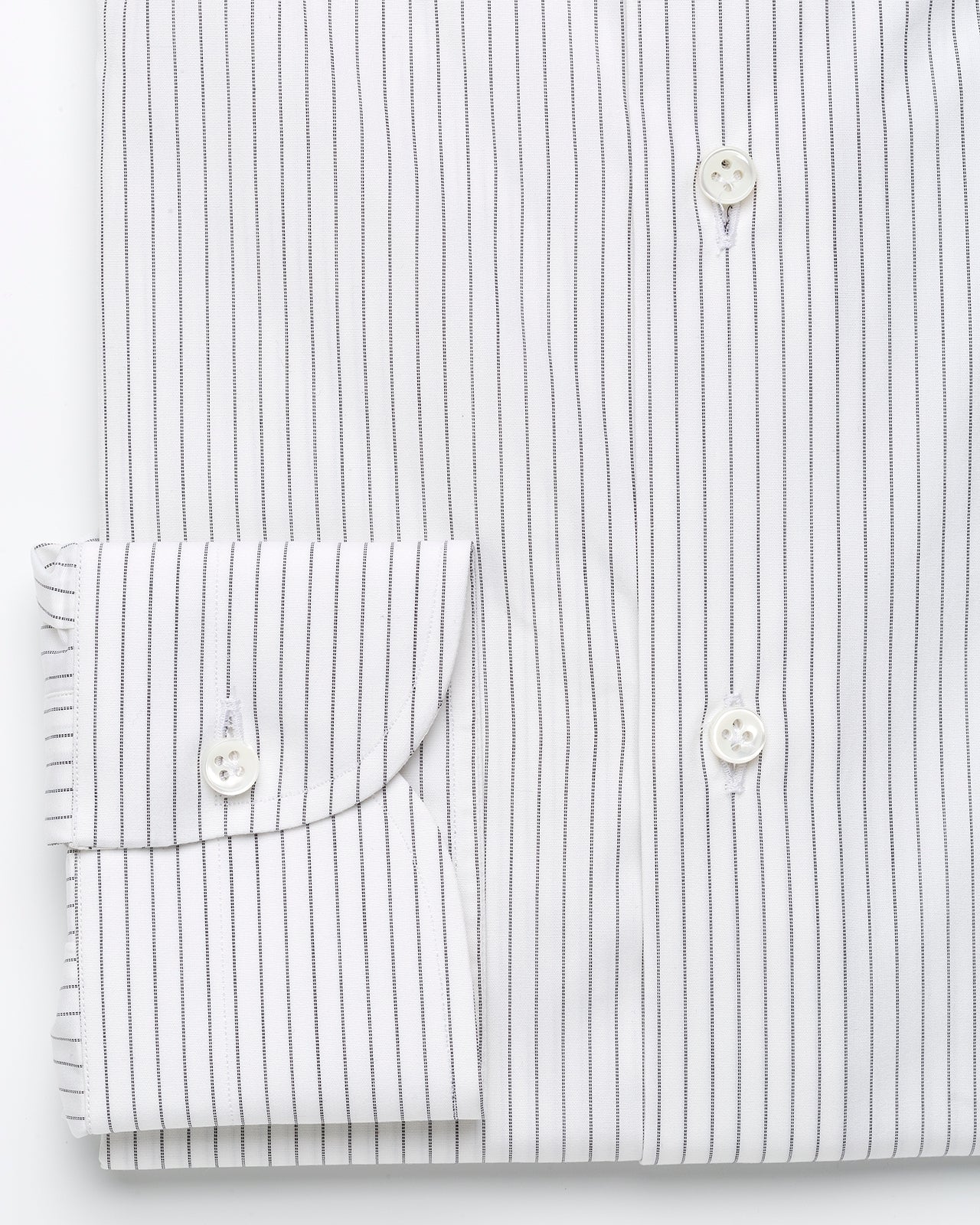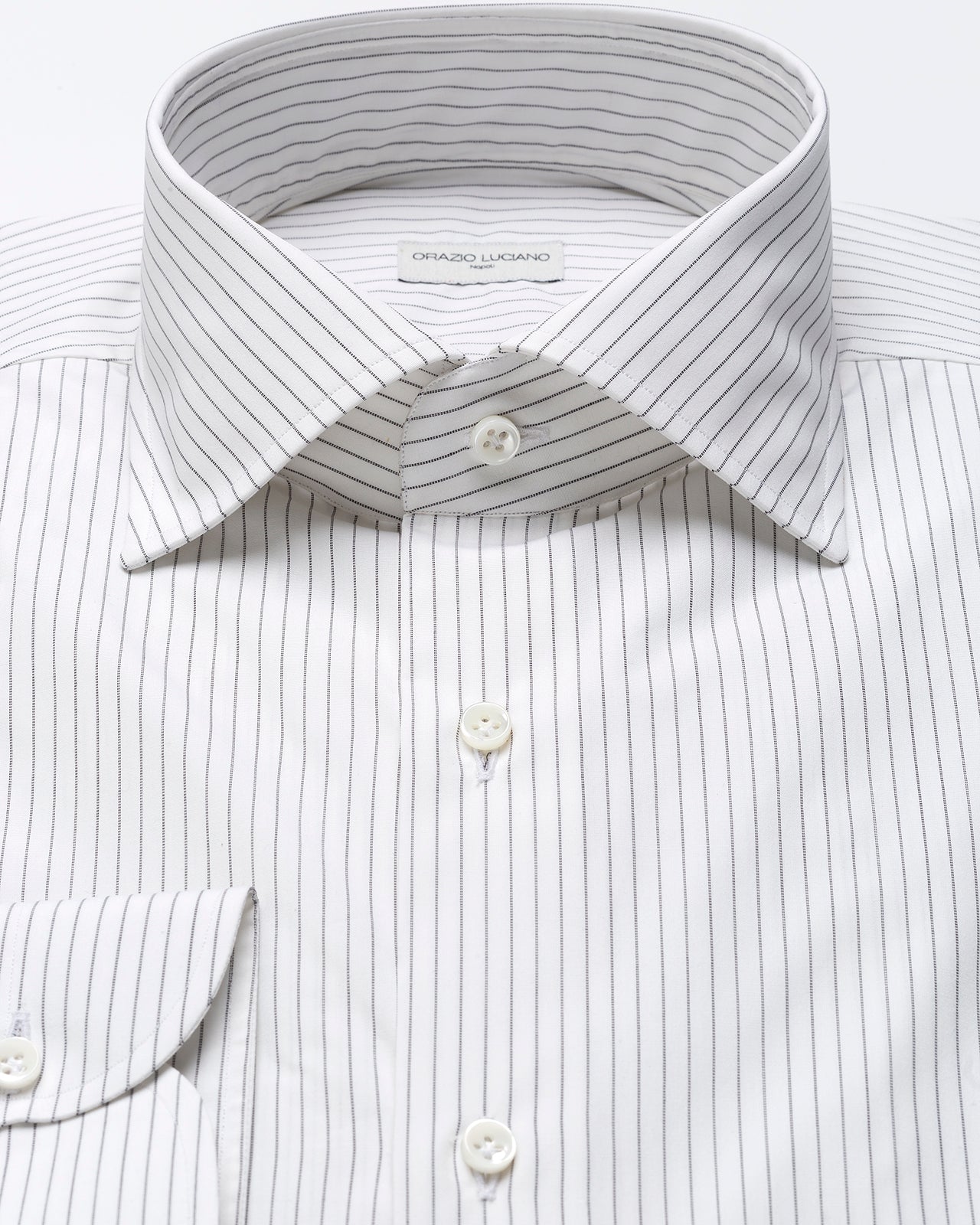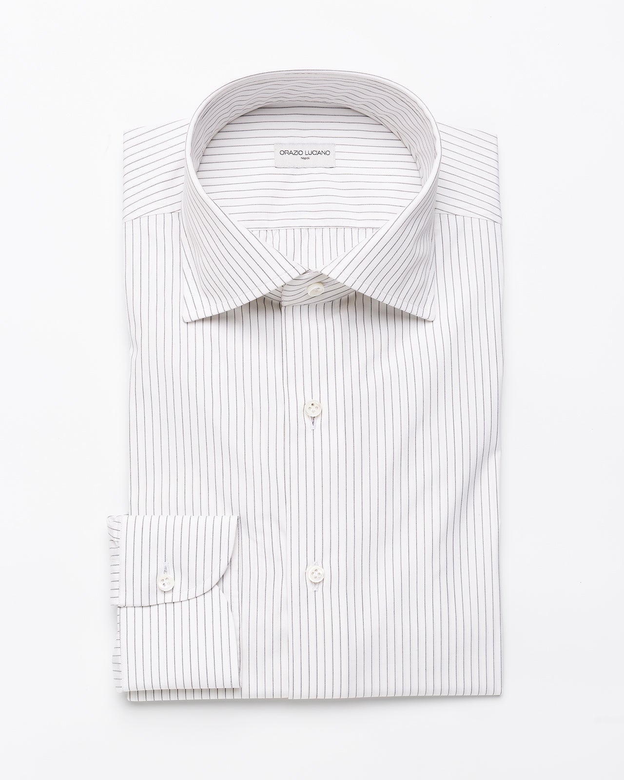 Subtelty is a hallmark of the divine. It speaks volumes of the purveyor without raising a voice or an eyebrow. This green striped white shirt made of cotton will garner perspective and depth in any ensemble while leaving room for other inspired sartorial brushstrokes. Its Neapolitan styling speaks to its permanence, while its handmade quality speaks for itself.
